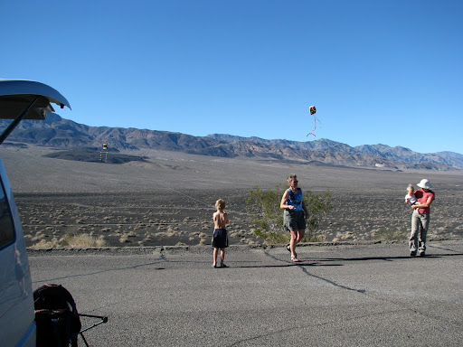 After we climbed out we rested, had lunch, and flew kites. We had talked about walking around the rim before the descent, but that idea evaporated along with our sweat as we sat in the only shade available: the side of the car, and had BLT sandwiches. The breeze was very nice. -- 2008.11.17 Death Valley 051 RW4.jpg